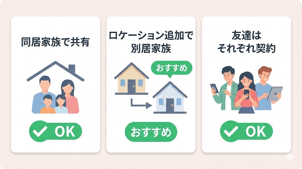 同居や別居の家族と使うケースは、利用ルールや運営の想定も少し違うので、友達との割り勘とは分けて考えたほうが安心です。