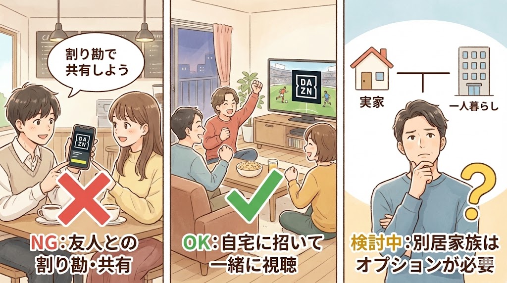 DAZNでは、同居家族や実家の家族など、家族間でのアカウント共有については案内や公式の説明でも想定されています。