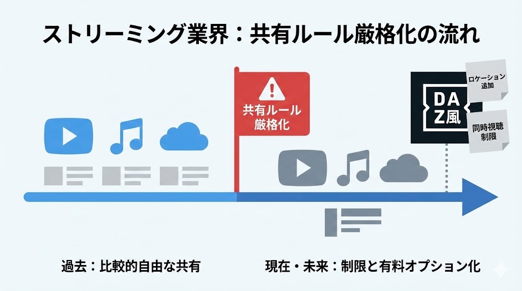 最後に、DAZN以外の配信サービスとの比較から「アカウント共有ルールの流れ」をざっくり押さえておきます。