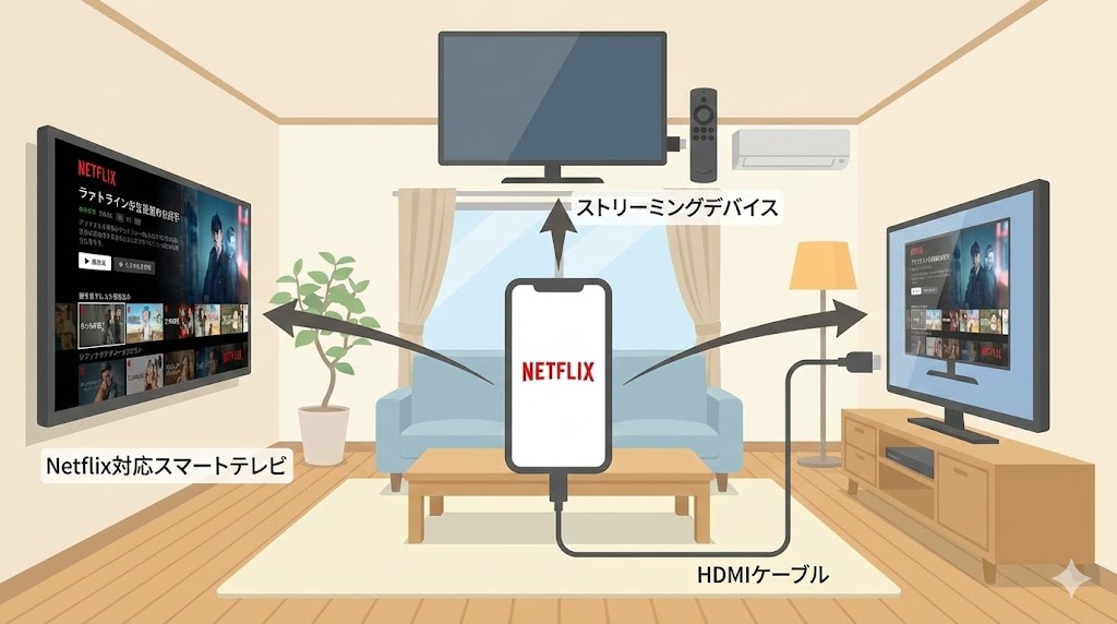 A. テレビ側のNetflixアプリかストリーミングデバイスを使う方法が安定しやすいです。 スマートテレビやFire TV Stickなどを使えば、スマホは作品選びに専念でき、接続トラブルが減ります。