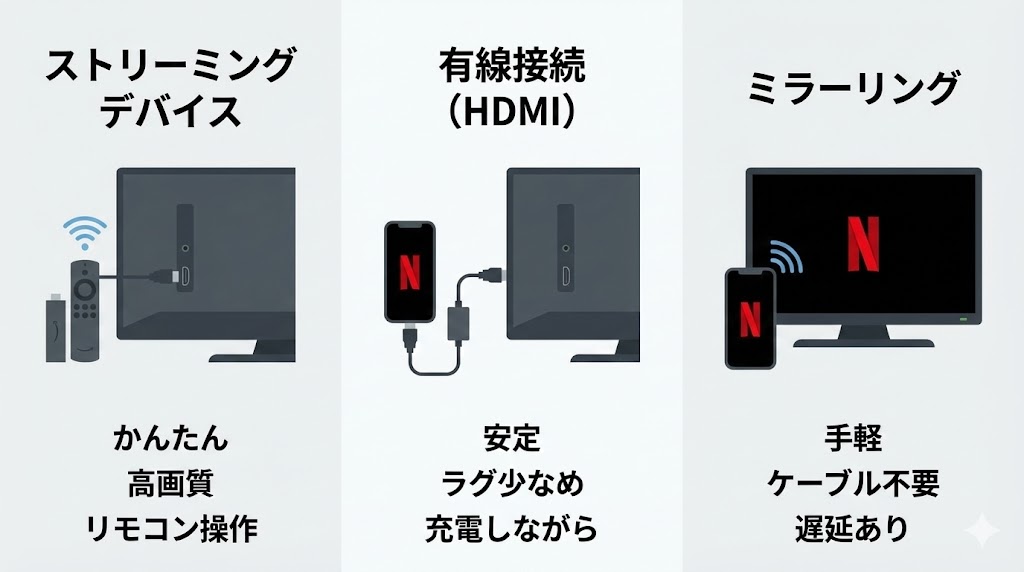同じ「スマホからテレビでNetflixを見たい」というゴールでも、接続方法によって使い心地や安定感はかなり変わります。