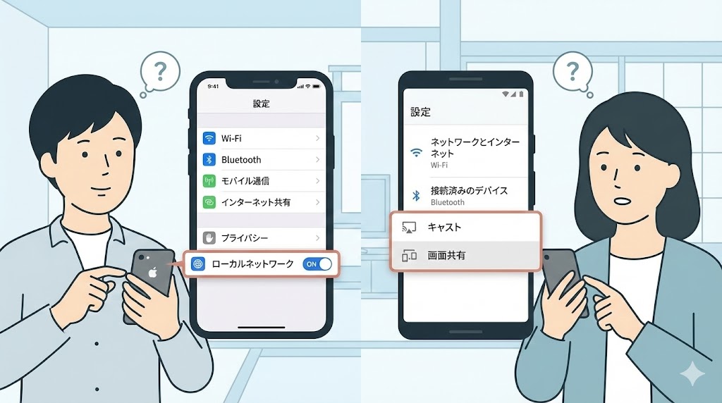アプリやデバイスに問題がなさそうでも、スマホ側の設定ひとつでキャストができなくなっていることもあります。