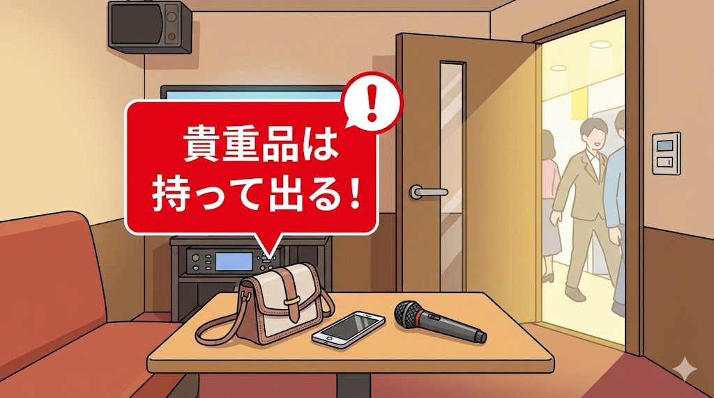 カラオケボックスの個室はオートロックではないことが多く、誰でも入れてしまいます。トイレに行く際は、財布とスマホは必ず持って出るようにしましょう。小さなバッグを持参するとスムーズです。(出典:一般社団法人全国カラオケ事業者協会)