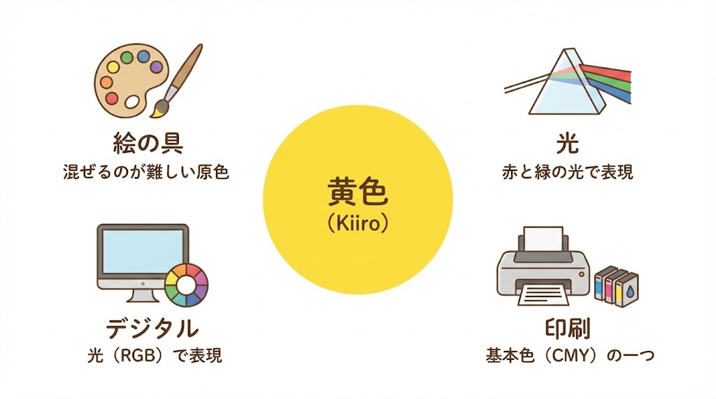 - 黄色は「絵の具・光・インク」で仕組みが違い、同じ考え方では扱えない。
