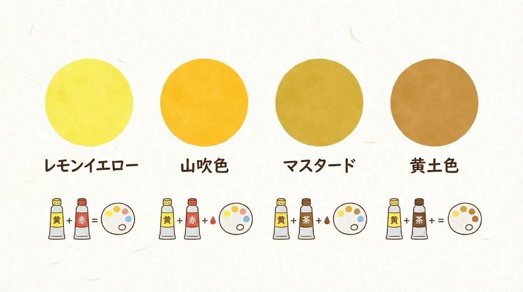| くすみイエロー・マスタード | 黄色+補色(紫・青)少量+白またはグレー | 補色を入れすぎると茶色に近づきやすい |