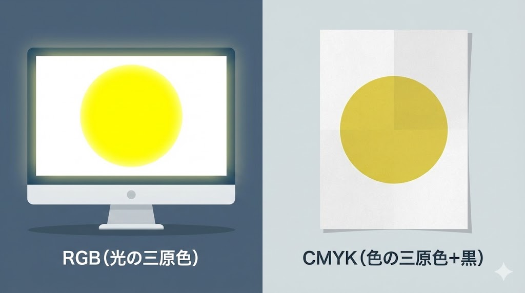 画面上では鮮やかに見えていた黄色が、印刷すると暗く見えるのは、CMYK変換と紙の性質が影響していることが多いです。