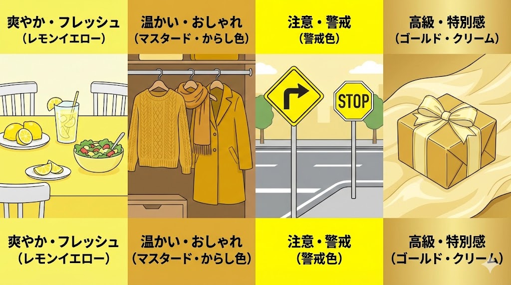 どの分野でも、黄色は「少しだけでも十分に存在感が出る色」と考え、まずはポイント使いから試してみると失敗しにくくなります。