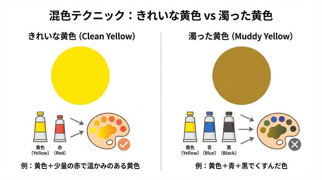 | 濁って黄土色になってしまった | 多色混合・補色を混ぜすぎ | 新しい黄色で塗り重ねる・影として活かす |