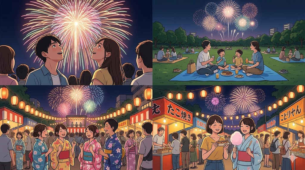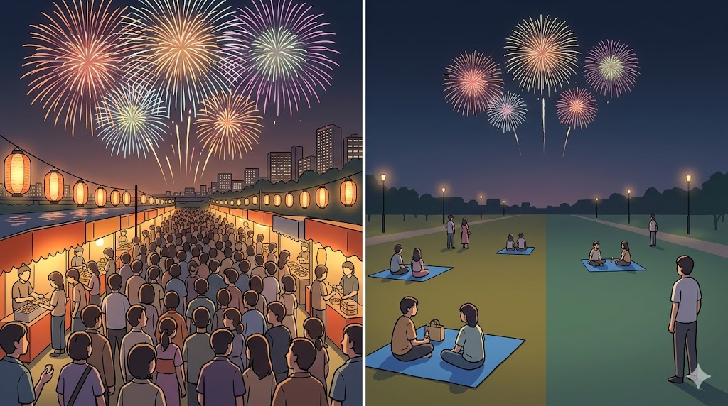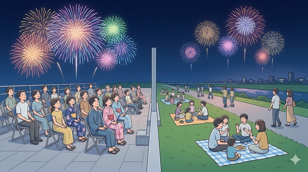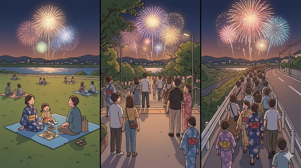 多くの地元の人は、「ベストな場所は自分で見つける」ことを楽しみのひとつとしています。午後の早い時間帯に現地に入り、人の流れや風向きを見ながら、静かで視界の開けた場所を探して場所取りをします。こうした地元流の楽しみ方は、観光客にはなかなか知られていませんが、花火大会を満喫するための秘訣でもあります。