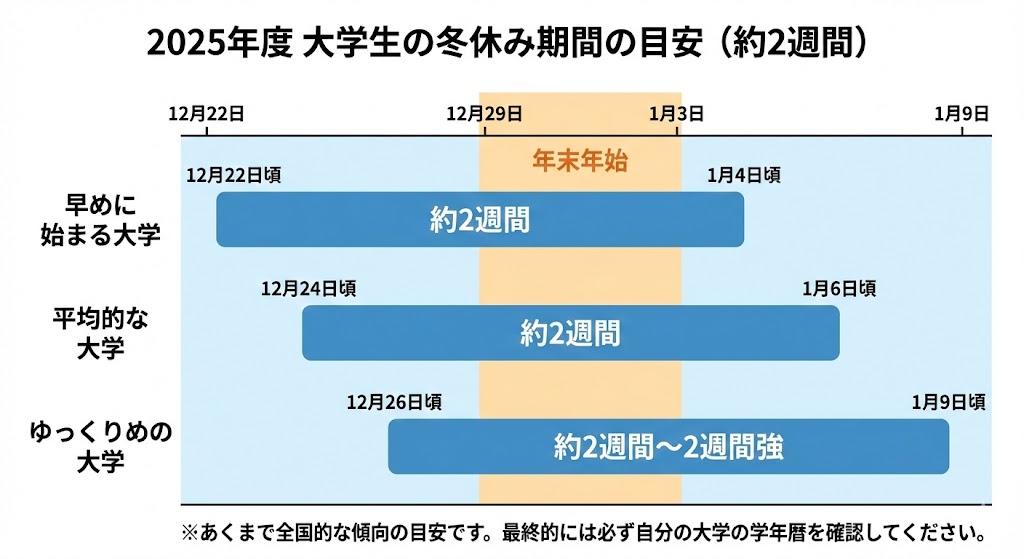 - 大学生の冬休みは、2025年度もおおむね約2週間が目安