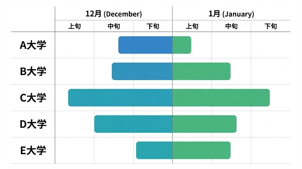 - 多くの大学で12月24〜25日ごろスタート/1月4〜7日ごろ終了の範囲に収まる
