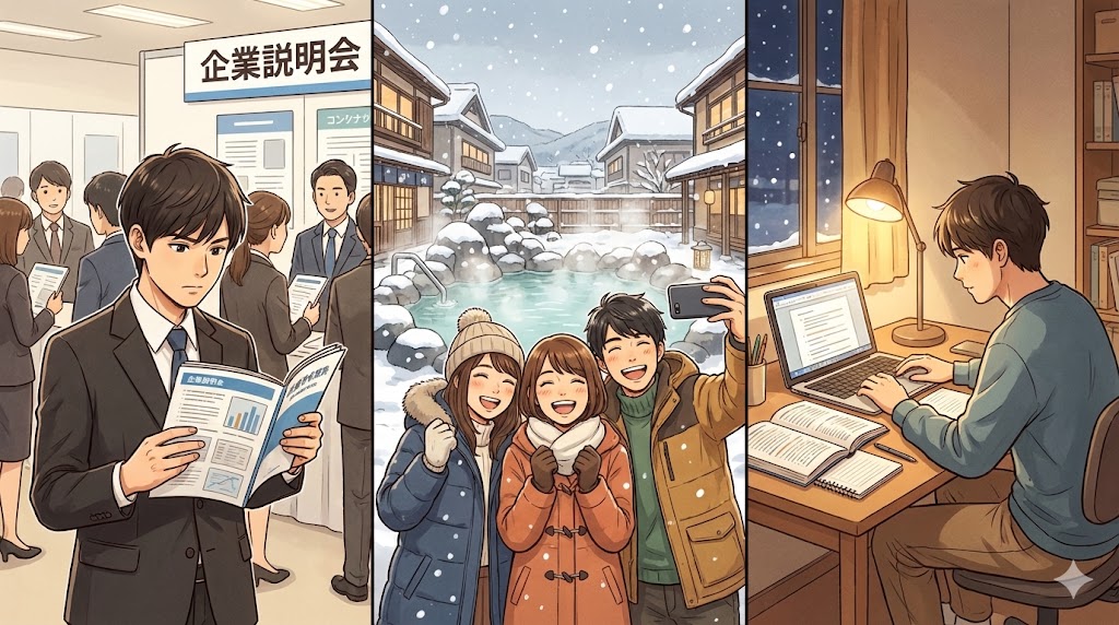 A. 3年生であれば、「就活準備:半分、休息・遊び:半分」くらいの配分が目安です。 自己分析・業界研究・OB訪問の準備など、春以降に効いてくる作業を冬のうちに少し進めておくと、後からかなり楽になります。