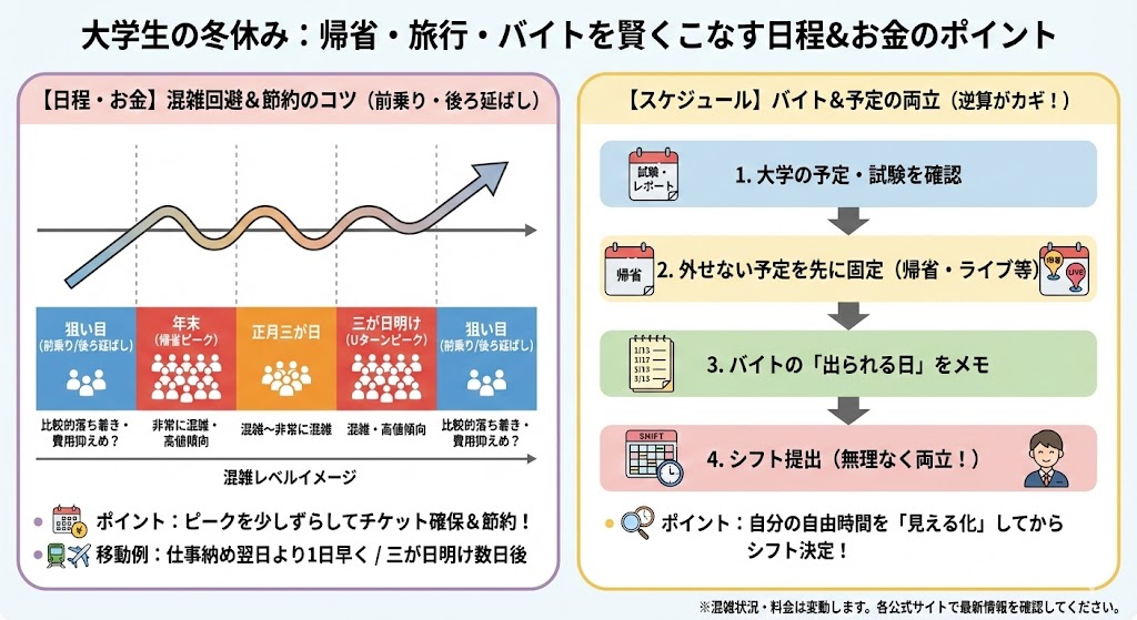- 学年・タイプ別に「バイト」「就活」「帰省・旅行」を組み合わせると、短い休みでも満足度が上げやすい