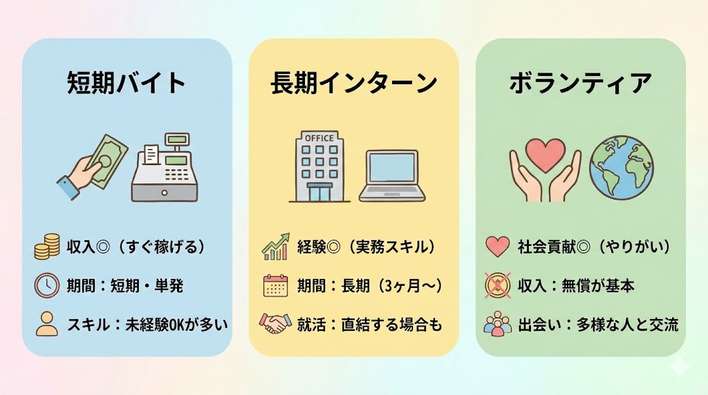 【比較表】バイト・インターン・ボランティアのメリット・デメリット
