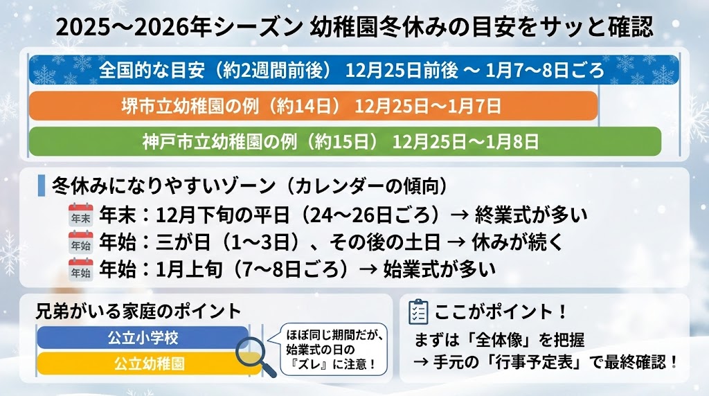 - 2025〜2026年の幼稚園の冬休みは、全国的に12月25日前後〜1月7〜8日ごろまでの約2週間が目安