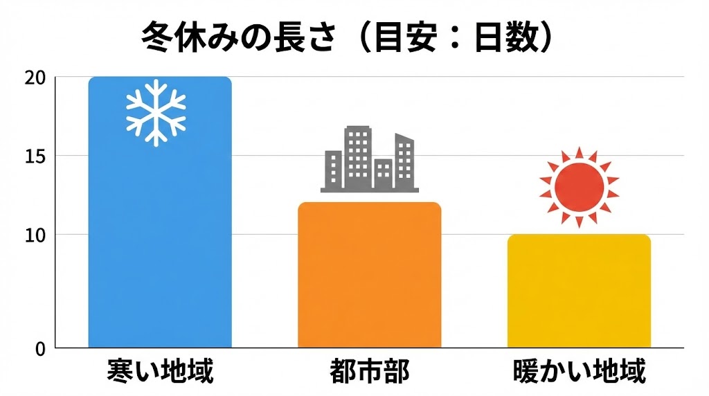 もちろん、すべての自治体がこの通りというわけではありませんが、「雪の影響が強い地域ほど、冬休みを長めに取る余地がある」とイメージしておくと理解しやすくなります。
