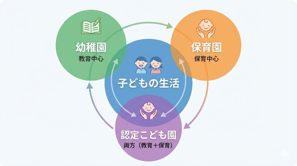 - 幼稚園:学校教育法に基づく“学校”寄りの施設
