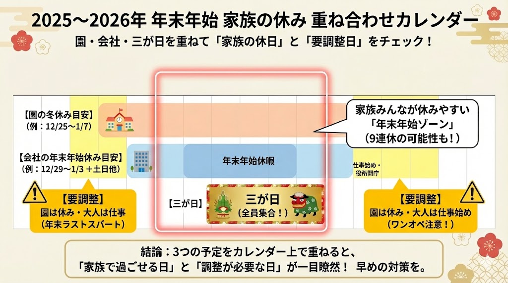 最後まで読むころには、会社のカレンダーと園の予定を重ねて、冬休みの過ごし方を安心して決められるようになりますよ。