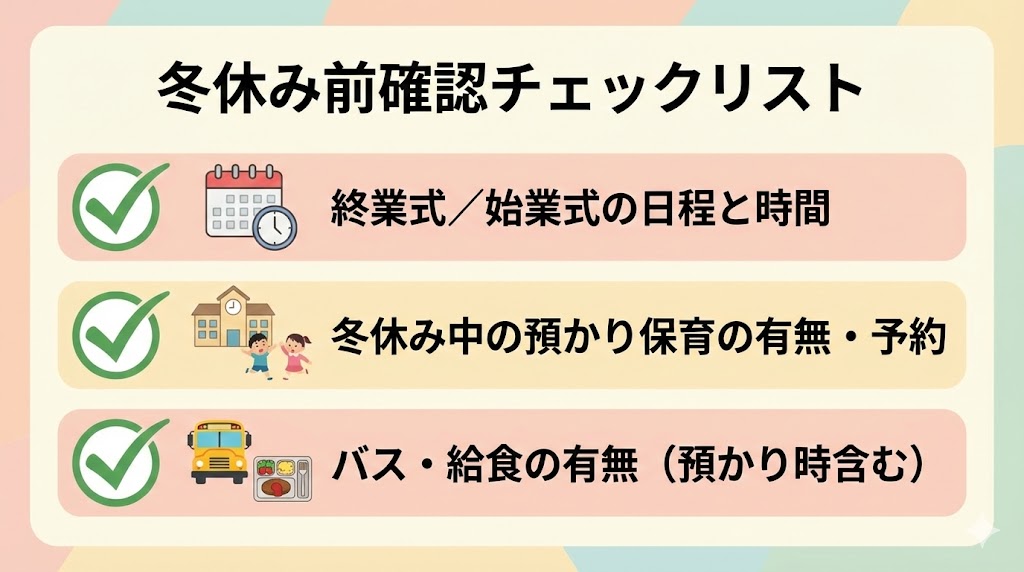 - 冬休み前に「預かり保育の日程・時間帯・料金・申込締切」と「急な休園時の連絡方法」を確認しておくと安心