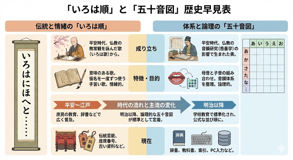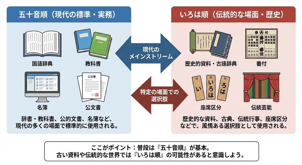 現代の辞書や教科書、公的な文書では五十音順が標準ですが、座席区分や番付、伝統的な資料などにはいろは順が静かに生き続けています。