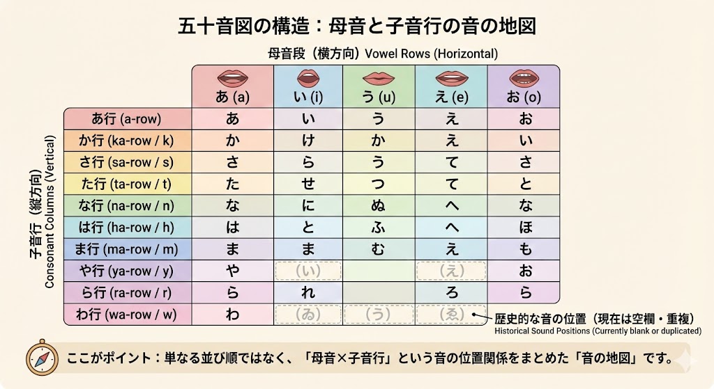 五十音図は、仮名を「母音」と「子音行」の組み合わせで整理した、日本語の音の地図のようなものです。