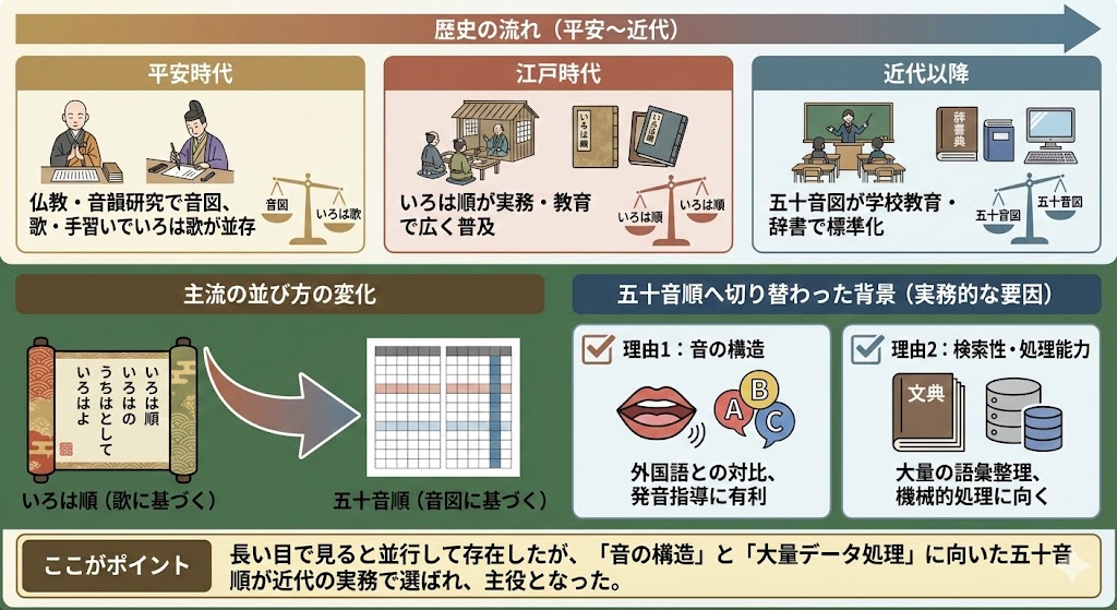 いろは順が劣っていたというより、五十音順のほうが「音の構造」と「大量のデータ処理」に向いていたため、近代以降の実務で選ばれやすくなったと考えると納得しやすくなります。