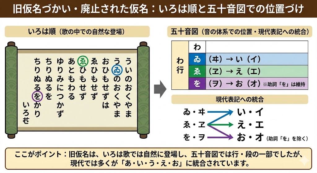 旧仮名は、いろは歌の中では自然に登場し、五十音図では行や段の一部として位置づけられていましたが、現代表記では多くが「あ・い・う・え・お」に統合されている、と押さえておくとスッキリします。