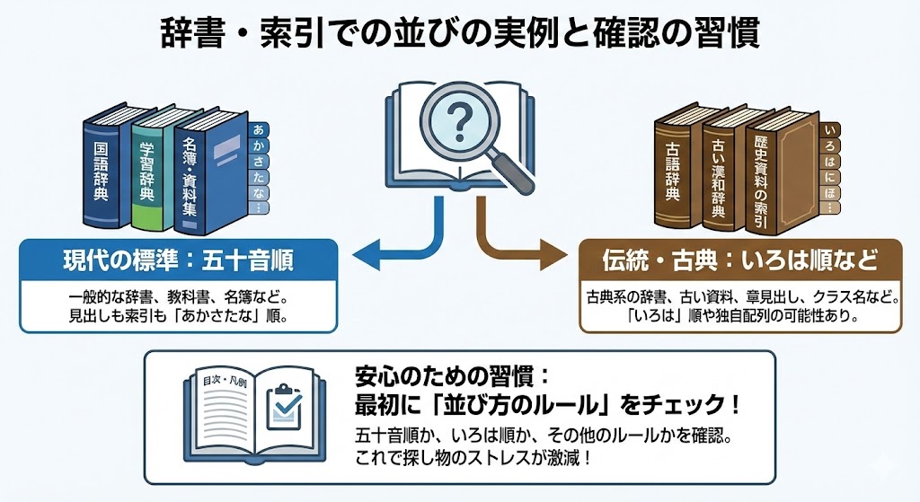 並び方に迷わないコツは、最初に「この本はどんな順番ルールでできているか」を確認することにあり、いろは順と五十音順の違いを知っておくと、そのチェックがぐっとスムーズになります。