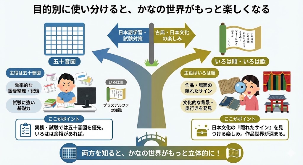 実務や試験の場面では五十音図が主役であり、いろは順は「少し余裕が出てきたときのプラスアルファ」と考えると、学習の優先順位がはっきりします。