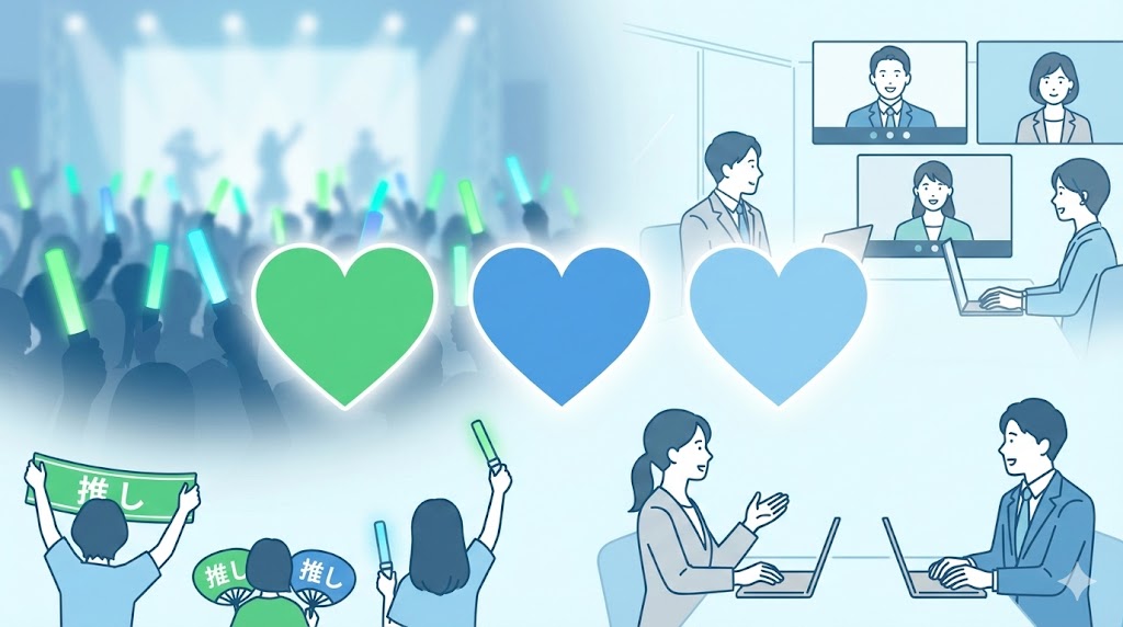 推し活の場では、ハートの色が「推しのメンバーカラー」と結びついていることがよくあります。