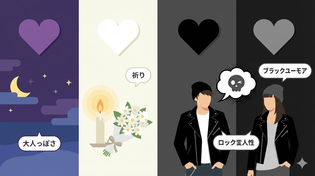 逆に、黒やグレーのハートは、相手によっては「闇っぽい」「自虐的」と受け取られることもあるため、恋愛文脈ではあまり使わないほうが無難です。
