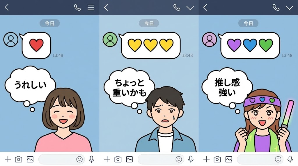 色違いのハートを並べるときは、「どの色にどんな意味がありそうか」を相手が知っているかどうかも重要で、推し活文化が共有されていない相手にはシンプルな色だけにとどめるのも一つの方法です。