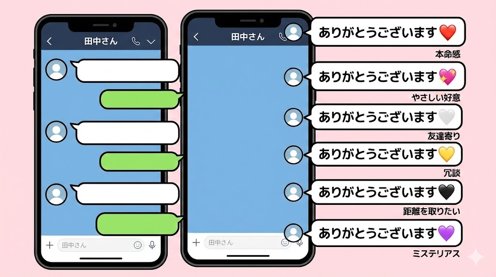 服やアイコン、ハート絵文字などにどの色を多く使うかで、「どこまで踏み込むつもりか」をさりげなく伝えられるのが色の面白いところです。