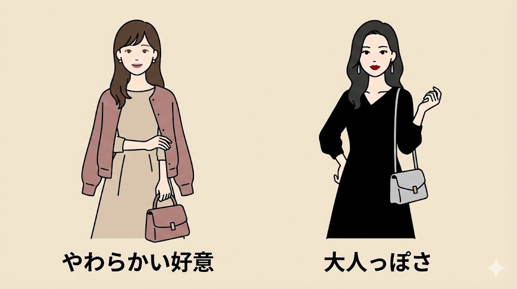 ただし、黒や濃い紫を全身で強く使いすぎると、距離があるように見えたり、「話しかけづらい」と感じさせてしまうこともあります。