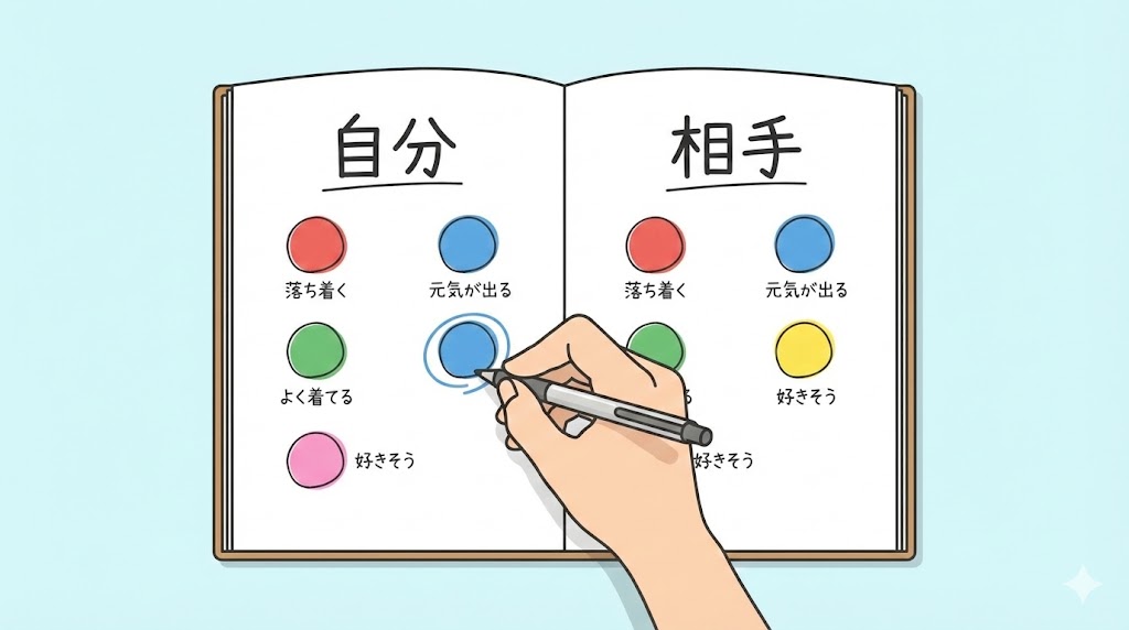 書き出してみるだけでも、「相手は安心感のある色が好きなんだな」「自分は強めの色を選びがちだな」など、傾向が見えてきます。