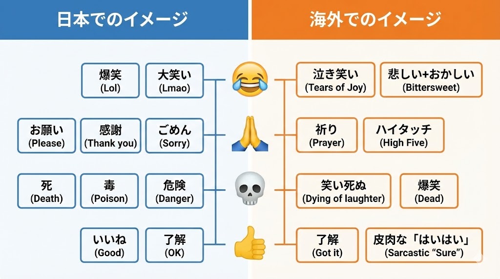 特に、😂🙏💀❤️など感情が強く出る絵文字ほど、文化差や世代差の影響を受けやすくなります。