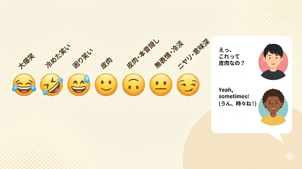 ここでは、「笑い」「困っている・泣いている」「微妙な表情」に分けて、日本と海外の感覚差を整理していきます。