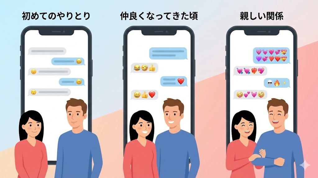 仕事よりは自由度が高いものの、「仲良くなり始め」と「かなり親しい」のあいだで、使える絵文字の幅は大きく変わります。