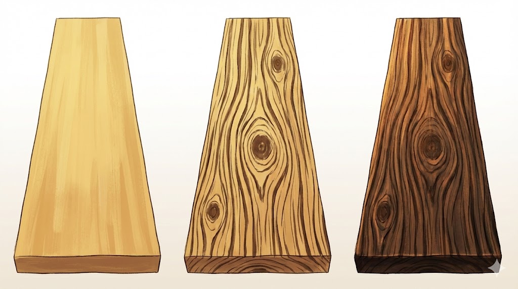 細い線を増やすより「木目の大きな流れ」を優先し、こげ茶の筋を少なめに絞ると、木目がうるさくなりすぎずにまとまりやすくなります。