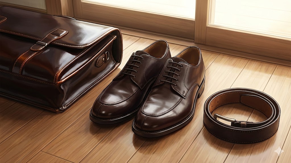 ツヤの強い革は、少し深めで赤みのあるこげ茶にすると高級感が出やすいです。