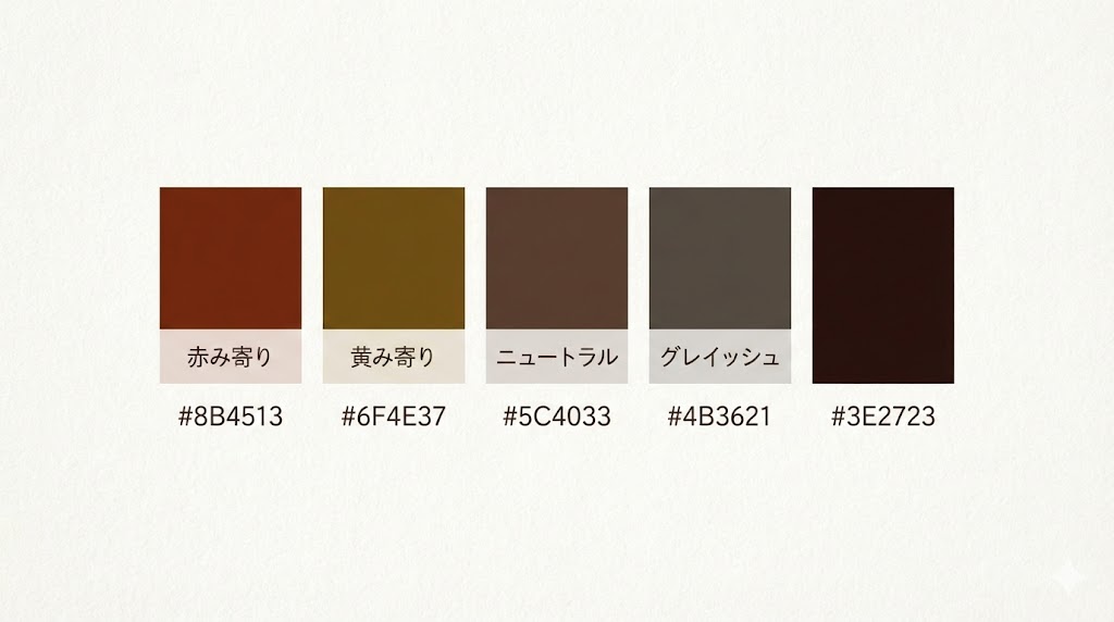 こげ茶の「赤み・黄み・グレー寄り」を少し変えるだけで、同じブラウンでも印象が大きく変わります。