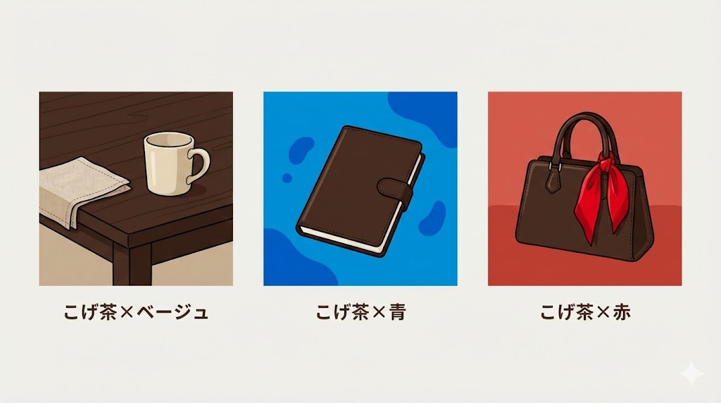 同じこげ茶でも、背景に白やベージュを多く置くと柔らかく見え、グレーや黒が増えると落ち着いた印象が強まります。