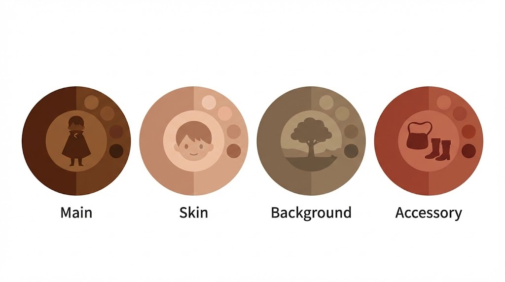 - ブラウンは「主役・肌・背景・小物」の4つの役割ごとにパレットを作ると迷いにくいです。