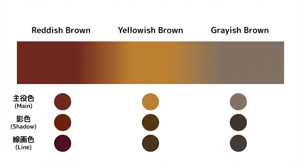 | 主役ブラウン | やや高めの彩度の赤みブラウン | 温かく目を引く、キャラの印象を決める色 |