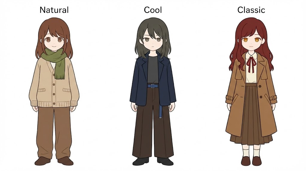 主役ブラウン・肌や影のブラウン・背景ブラウン・小物ブラウンをあらかじめセットにしておくと、その日によって色の気分が変わっても、全体のトーンがぶれにくくなります。