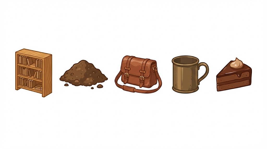 ファンタジー・レトロ系の世界観では、くすみブラウンをベースに、少しだけ彩度の高いアクセントを足すと雰囲気が出ます。