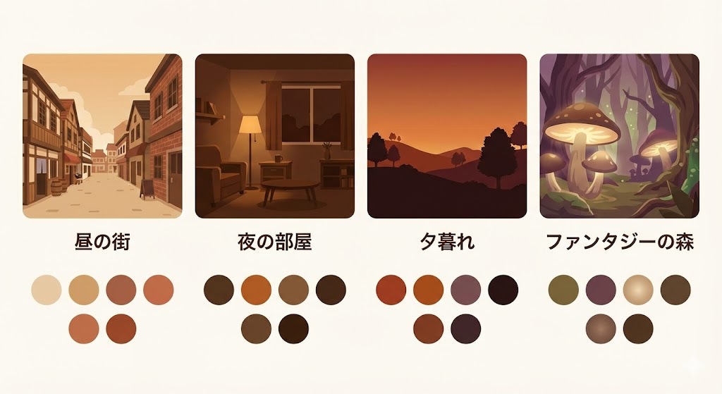 シーン別ブラウン配色レシピ|昼・夜・屋内・ファンタジーで世界観を作る