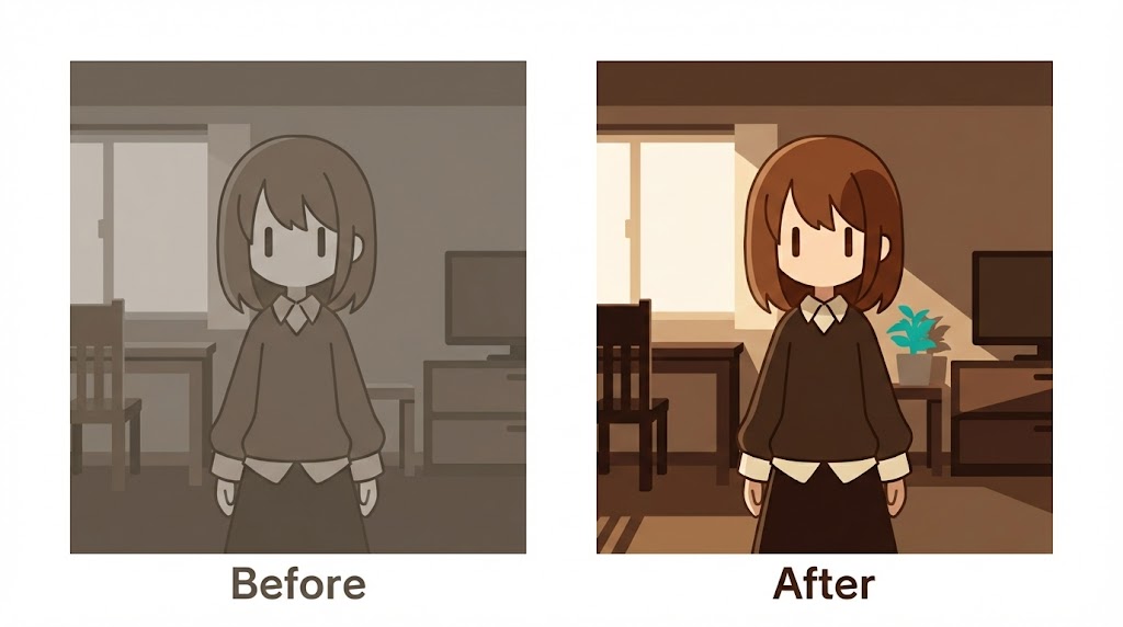 | 画面がどんよりして見える | 明度差・彩度差が足りない | ベースを明るく、影と線画を少し暗くして階段を作る |