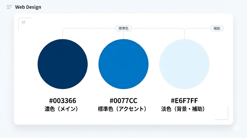 Webでよく使われる青を、まずは「基準色」として3つ押さえておくと選びやすくなります。