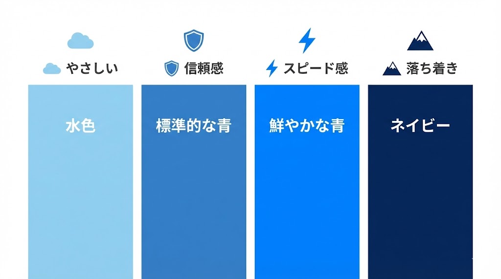 ここでは、Webデザインでよく使われる青のざっくりしたカテゴリと、印象の違いを整理します。